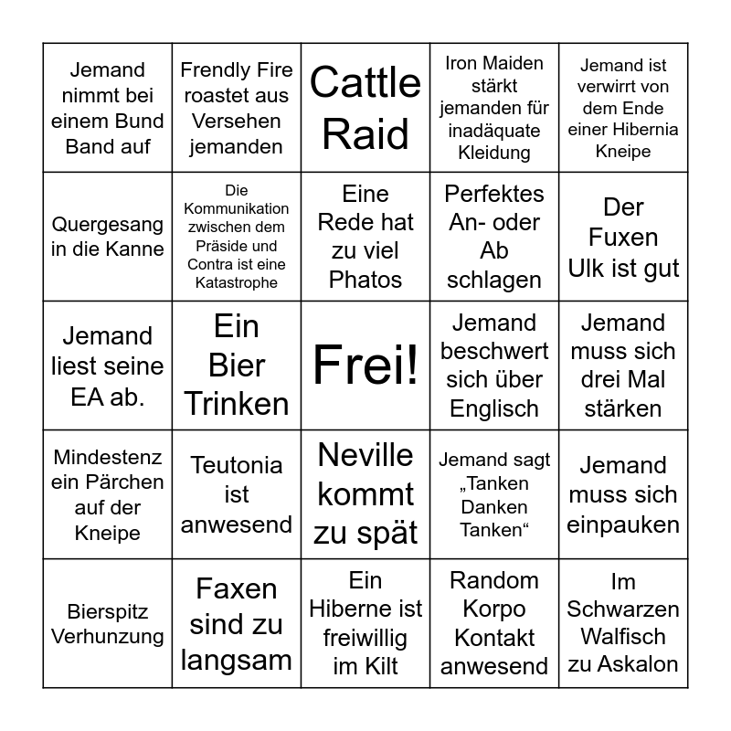 This bingo card has a free space and 28 words: Jemand muss sich einpauken, False Falg singt Badner Lieder, Perfektes An- oder Ab schlagen, Random Korpo Kontakt anwesend, Quergesang in die Kanne, Cattle Raid, Frendly Fire roastet aus Versehen jemanden, Mindestenz ein Pärchen auf der Kneipe, Jemand beschwert sich über Englisch, Bierspitz Verhunzung, Jemand liest seine EA ab., Iron Maiden stärkt jemanden für inadäquate Kleidung, Faxen sind zu langsam, Ein Hiberne ist freiwillig im Kilt, Der Fuxen Ulk ist gut, Jemand lässt sein Gesangsbuch offen, Teutonia ist anwesend, Die Kommunikation zwischen dem Präside und Contra ist eine Katastrophe, Eine Rede hat zu viel Phatos, Neville kommt zu spät, Jemand nimmt bei einem Bund Band auf, Oh Alte Burschen Herrlichkeit, Im Schwarzen Walfisch zu Askalon, Ein Bier Trinken, Jemand muss sich drei Mal stärken, Jemand sagt „Tanken Danken Tanken“, Jemand ist verwirrt von dem Ende einer Hibernia Kneipe and Jemand ist spontan Mitglied bei Korps Spiralia.