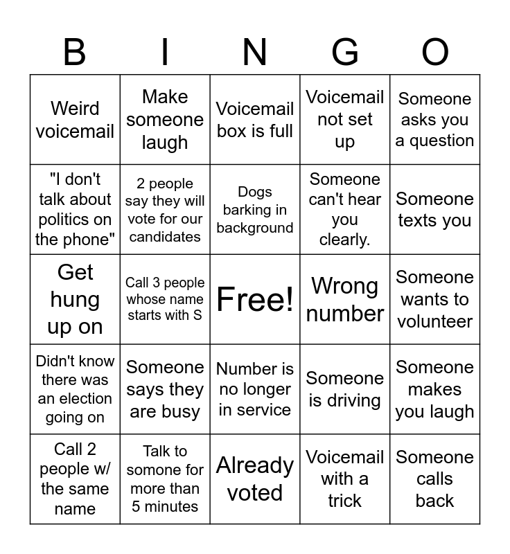 This bingo card has a free space and 29 words: Call 2 people w/ the same name, Find out interesting fact about someone, Call 3 people whose name starts with S, Someone is rude to you, Weird voicemail, Voicemail box is full, 2 people say they will vote for our candidates, Someone says they are busy, Wrong number, Talk to somone for more than 5 minutes, Someone wants to volunteer, Someone calls back, Already voted, Voicemail with a trick, Someone texts you, Get thanked for calling, Number is no longer in service, Didn't know there was an election going on, Someone asks you a question, Get hung up on, Someone is driving, Enthusiastic voter!, Someone can't hear you clearly., "I don't talk about politics on the phone", Voicemail not set up, Make someone laugh, Someone makes you laugh, Dogs barking in background and Caller is driving.