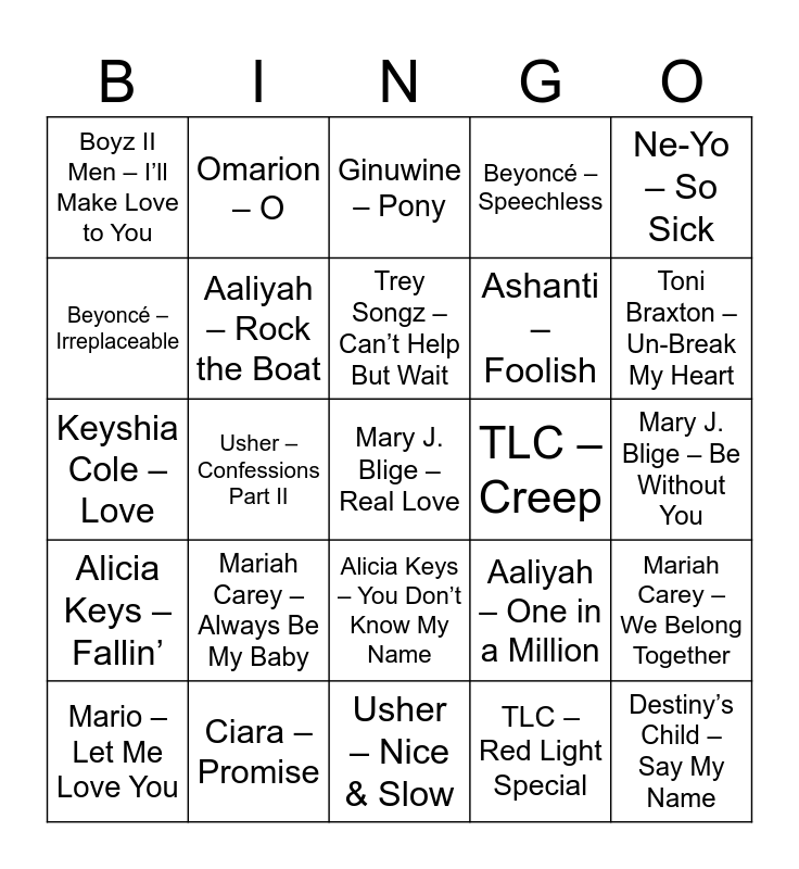 This bingo card has 31 words: Usher – Nice & Slow, Usher – U Got It Bad, Usher – Confessions Part II, Boyz II Men – End of the Road, Boyz II Men – I’ll Make Love to You, Ginuwine – Pony, Aaliyah – Rock the Boat, Aaliyah – One in a Million, TLC – Creep, TLC – Red Light Special, Mary J. Blige – Be Without You, Mary J. Blige – Real Love, Destiny’s Child – Say My Name, Destiny’s Child – Cater 2 U, Toni Braxton – Un-Break My Heart, Toni Braxton – You’re Makin’ Me High, Mariah Carey – We Belong Together, Mariah Carey – Always Be My Baby, Alicia Keys – Fallin’, Alicia Keys – You Don’t Know My Name, Ne-Yo – So Sick, Ne-Yo – Miss Independent, Mario – Let Me Love You, Omarion – O, Ashanti – Foolish, Beyoncé – Irreplaceable, Beyoncé – Speechless, Keyshia Cole – Love, Ciara – Promise, Trey Songz – Can’t Help But Wait and Trey Songz – Neighbors Know My Name.