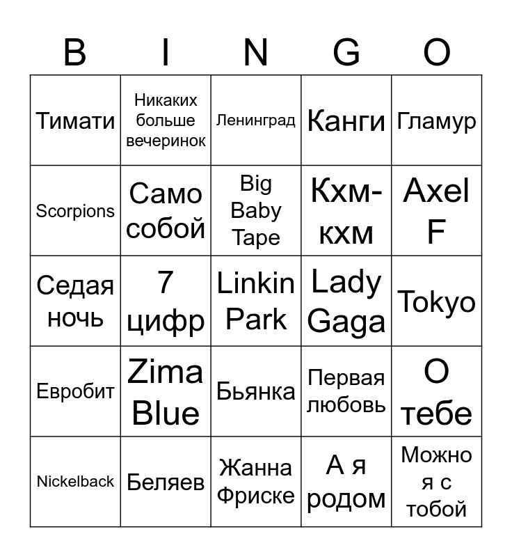 This bingo card has a free space and 24 words: Zima Blue, Беляев, Big Baby Tape, Nickelback, Гламур, Тимати, Scorpions, Никаких больше вечеринок, Lady Gaga, Бьянка, Кхм-кхм, Седая ночь, Первая любовь, О тебе, Само собой, А я родом, Tokyo, Ленинград, Axel F, 7 цифр, Можно я с тобой, Евробит, Канги and Жанна Фриске.
