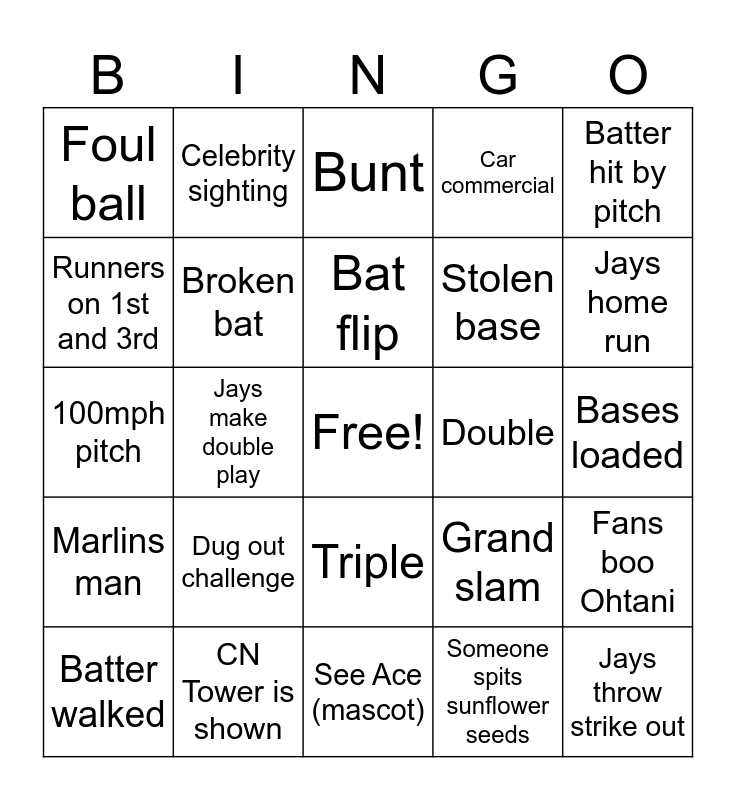 This bingo card has a free space and 24 words: Dug out challenge, CN Tower is shown, Bat flip, Batter walked, Batter hit by pitch, Foul ball, Runners on 1st and 3rd, Celebrity sighting, Double, Triple, Stolen base, 100mph pitch, Grand slam, Fans boo Ohtani, Broken bat, Someone spits sunflower seeds, Bases loaded, Bunt, Jays home run, Jays make double play, Jays throw strike out, Marlins man, Car commercial and See Ace (mascot).
