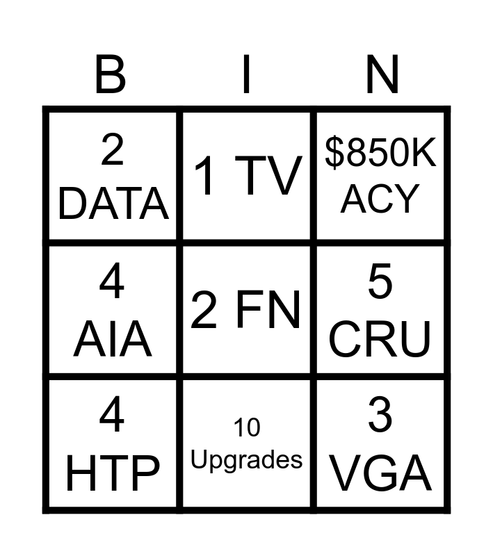 This bingo card has a free space and 8 words: 5 CRU, $850K ACY, 1 TV, 4 HTP, 2 DATA, 3 VGA, 4 AIA and 10 Upgrades.