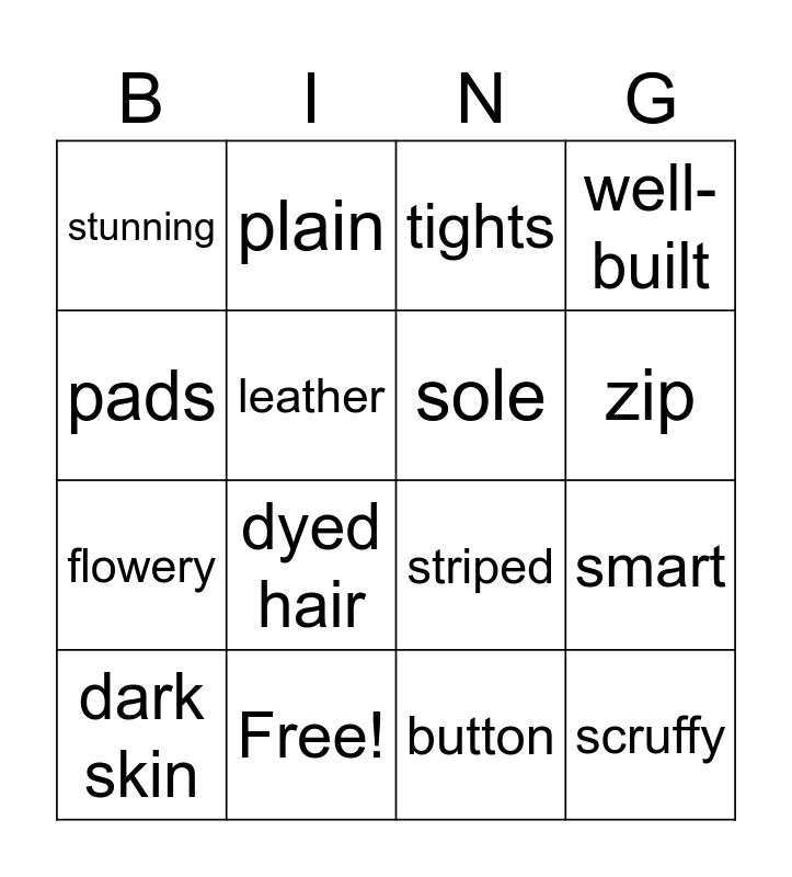 This bingo card has 28 words: colourful, checked, flowery, suit, leather, tights, plain, scruffy, Free!, loose, striped, well-built, pale skin, freckles, dyed hair, laces, sleeve, sole, zip, collar, stunning, impressive, dark skin, smart, button, hood, pads and cotton.