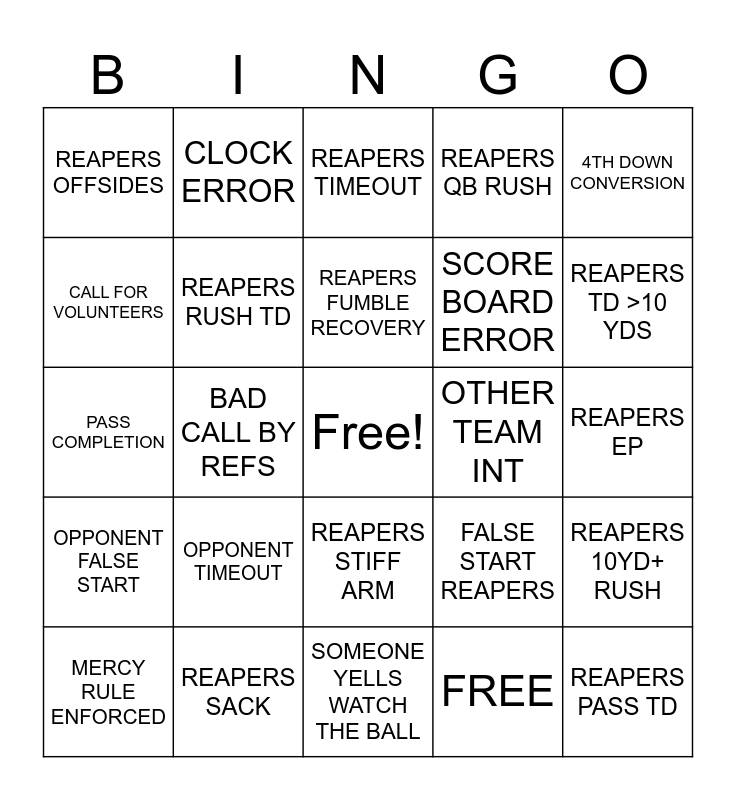 This bingo card has a free space and 30 words: REAPERS SACK, HOLDING PENALTY REAPERS, BAD CALL BY REFS, OFFSIDES OTHER TEAM, REAPERS OFFSIDES, REAPERS TIMEOUT, REAPERS RUSH TD, REAPERS STIFF ARM, OTHER TEAM INT, SOMEONE YELLS WATCH THE BALL, REAPERS EP, REAPERS PASS TD, FREE, REAPERS INT, REAPERS TD >10 YDS, EP BLOCKED, FALSE START REAPERS, OPPONENT FALSE START, OPPONENT TIMEOUT, 4TH DOWN CONVERSION, PASS COMPLETION, CHAIN GANG FAIL, CLOCK ERROR, SCORE BOARD ERROR, CALL FOR VOLUNTEERS, REAPERS QB RUSH, REAPERS 10YD+ RUSH, MERCY RULE ENFORCED, REAPERS FUMBLE RECOVERY and 4TH DOWN STOP.