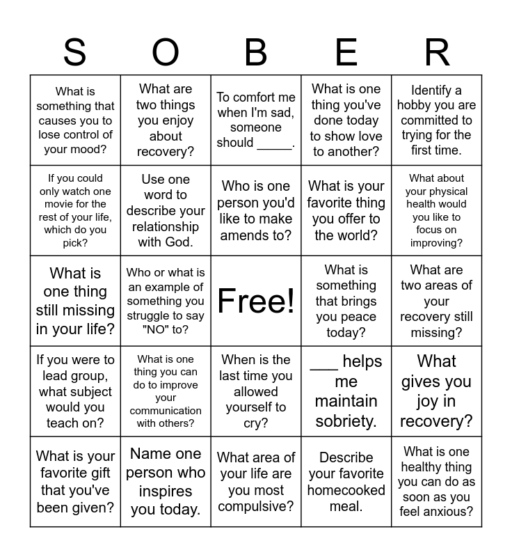 This bingo card has a free space and 24 words: What is one thing you can do to improve your communication with others?, Name one person who inspires you today., Who is one person you'd like to make amends to?, What is your favorite gift that you've been given?, Identify a hobby you are committed to trying for the first time., What is something that causes you to lose control of your mood?, If you could only watch one movie for the rest of your life, which do you pick?, What are two things you enjoy about recovery?, What is something that brings you peace today?, When is the last time you allowed yourself to cry?, What is your favorite thing you offer to the world?, What is one thing still missing in your life?, ___ helps me maintain sobriety., What gives you joy in recovery?, Use one word to describe your relationship with God., Describe your favorite homecooked meal., What are two areas of your recovery still missing?, To comfort me when I'm sad, someone should _____., What about your physical health would you like to focus on improving?, Who or what is an example of something you struggle to say "NO" to?, What is one healthy thing you can do as soon as you feel anxious?, If you were to lead group, what subject would you teach on?, What is one thing you've done today to show love to another? and What area of your life are you most compulsive?.