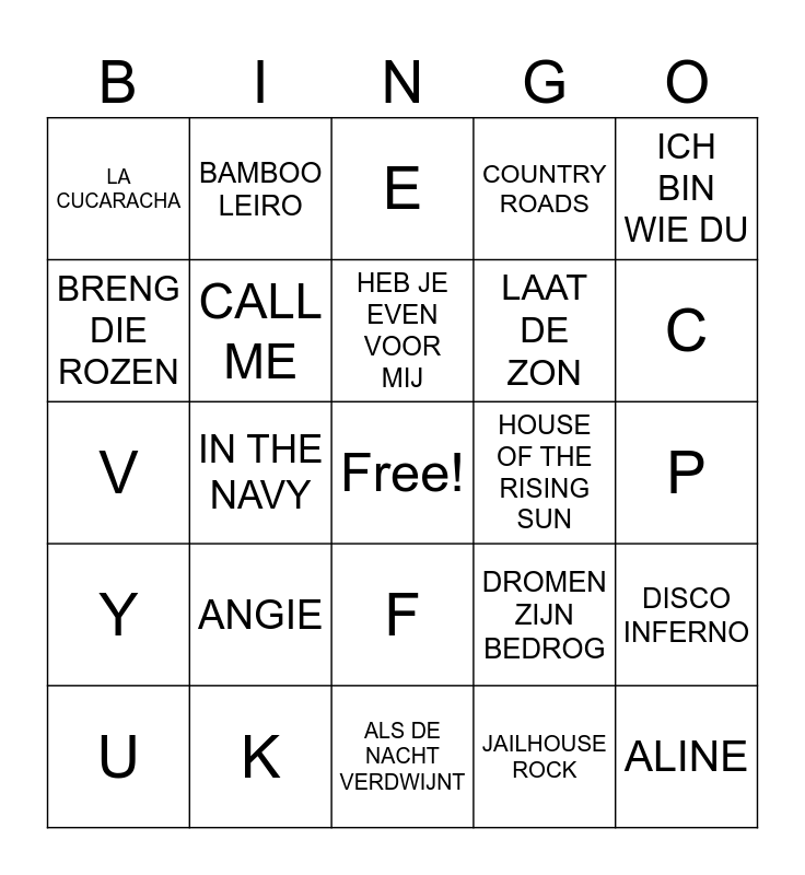 This bingo card has a free space and 50 words: GREEN GREEN GRASS, ALINE, ALL NIGHT LONG, ALS DE NACHT VERDWIJNT, ANGIE, BABY COME BACK, BAMBOO LEIRO, BORN TO BE ALIVE, BRENG DIE ROZEN, CALIFORNIA BLUE, CALL ME, COUNTRY ROADS, DISCO INFERNO, DROMEN ZIJN BEDROG, FERNANDO, GLORIA, HEB JE EVEN VOOR MIJ, HOUSE OF THE RISING SUN, I'LL GO WHERE THE MUSIC TAKES ME, ICH BIN WIE DU, IN THE NAVY, JAILHOUSE ROCK, LA CUCARACHA, LAAT DE ZON, A, B, C, D, E, F, G, H, I, J, K, L, M, N, O, P, Q, R, S, T, U, V, W, X, Y and OK.