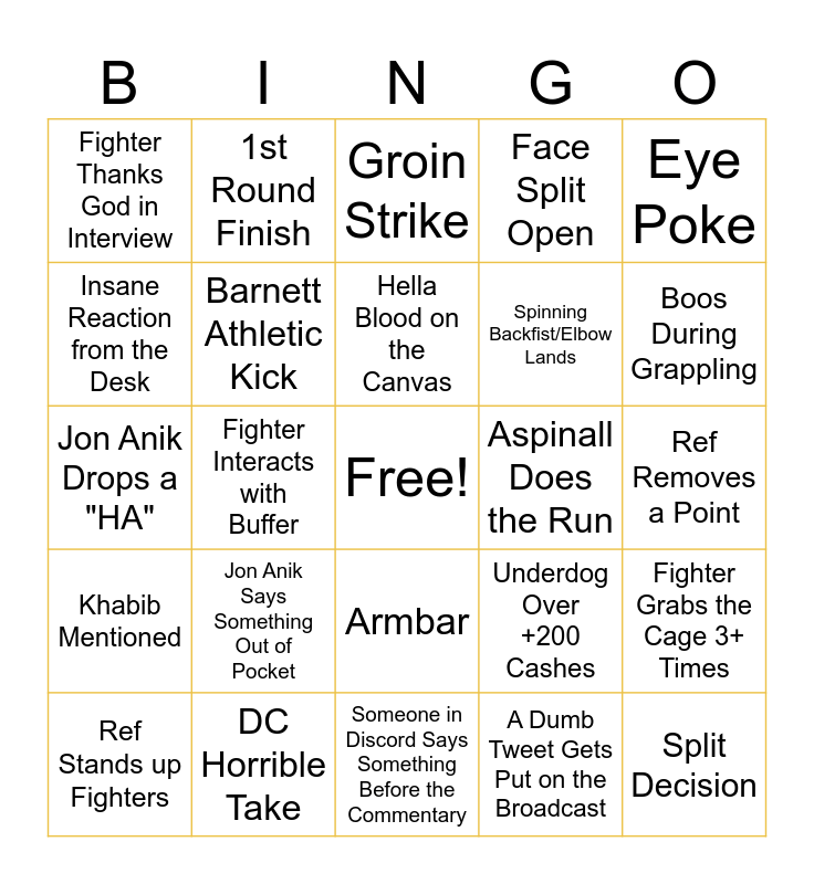 This bingo card has a free space and 24 words: Jon Anik Says Something Out of Pocket, DC Horrible Take, Hella Blood on the Canvas, Ref Stands up Fighters, Eye Poke, Fighter Thanks God in Interview, Insane Reaction from the Desk, 1st Round Finish, Aspinall Does the Run, Armbar, Spinning Backfist/Elbow Lands, Jon Anik Drops a "HA", Underdog Over +200 Cashes, Fighter Grabs the Cage 3+ Times, Barnett Athletic Kick, A Dumb Tweet Gets Put on the Broadcast, Ref Removes a Point, Groin Strike, Boos During Grappling, Fighter Interacts with Buffer, Split Decision, Khabib Mentioned, Face Split Open and Someone in Discord Says Something Before the Commentary.