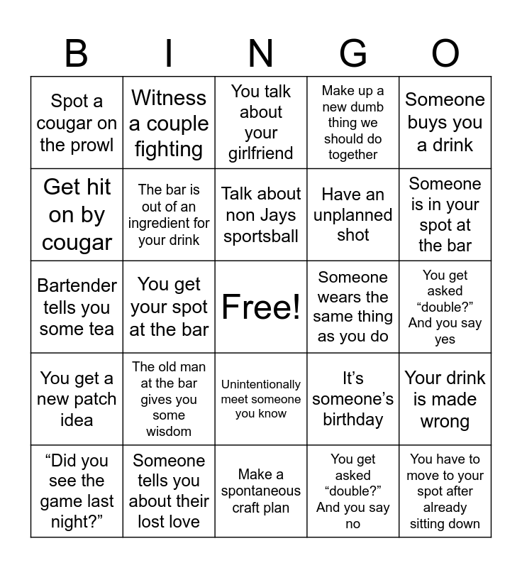 This bingo card has a free space and 24 words: The old man at the bar gives you some wisdom, Someone tells you about their lost love, Talk about non Jays sportsball, “Did you see the game last night?”, Someone buys you a drink, Spot a cougar on the prowl, Get hit on by cougar, Witness a couple fighting, Someone wears the same thing as you do, Unintentionally meet someone you know, Have an unplanned shot, Bartender tells you some tea, It’s someone’s birthday, Your drink is made wrong, The bar is out of an ingredient for your drink, You get asked “double?” And you say no, You get asked “double?” And you say yes, You talk about your girlfriend, Someone is in your spot at the bar, You get your spot at the bar, You have to move to your spot after already sitting down, You get a new patch idea, Make up a new dumb thing we should do together and Make a spontaneous craft plan.