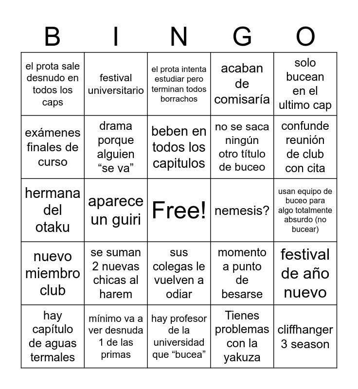 This bingo card has a free space and 24 words: se suman 2 nuevas chicas al harem, mínimo va a ver desnuda 1 de las primas, beben en todos los capitulos, hay capítulo de aguas termales, solo bucean en el ultimo cap, el prota sale desnudo en todos los caps, exámenes finales de curso, festival universitario, nemesis?, sus colegas le vuelven a odiar, no se saca ningún otro título de buceo, hermana del otaku, momento a punto de besarse, festival de año nuevo, drama porque alguien “se va”, Tienes problemas con la yakuza, usan equipo de buceo para algo totalmente absurdo (no bucear), el prota intenta estudiar pero terminan todos borrachos, confunde reunión de club con cita, aparece un guiri, cliffhanger 3 season, nuevo miembro club, acaban de comisaría and hay profesor de la universidad que “bucea”.