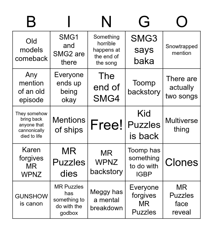 This bingo card has a free space and 24 words: MR Puzzles dies, MR Puzzles has something to do with the godbox, The end of SMG4, GUNSHOW is canon, Snowtrapped mention, Old models comeback, Any mention of an old episode, SMG1 and SMG2 are there, Kid Puzzles is back, MR WPNZ backstory, Toomp backstory, They somehow bring back anyone that cannonically died to life, Toomp has something to do with IGBP, Clones, Everyone ends up being okay, Everyone forgives MR Puzzles, Multiverse thing, Something horrible happens at the end of the song, There are actually two songs, Mentions of ships, MR Puzzles face reveal, Karen forgives MR WPNZ, SMG3 says baka and Meggy has a mental breakdown.