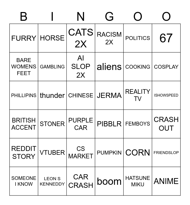 This bingo card has 36 words: PUMPKIN, CS MARKET, boom, BARE WOMENS FEET, BRITISH ACCENT, JERMA, GAMBLING, CAR CRASH, POLITICS, CORN, COSPLAY, RACISM 2X, FRIENDSLOP, thunder, aliens, FURRY, REDDIT STORY, REALITY TV, PHILLIPINS, CATS 2X, CHINESE, STONER, PIBBLR, PURPLE CAR, FEMBOYS, HORSE, COOKING, LEON S KENNEDDY, AI SLOP 2X, 67, ANIME, SOMEONE I KNOW, CRASH OUT, ISHOWSPEED, VTUBER and HATSUNE MIKU.