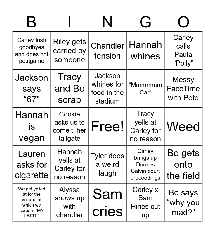This bingo card has a free space and 24 words: Hannah yells at Carley for no reason, Alyssa shows up with chandler, Jackson whines for food in the stadium, We get yelled at for the volume at which we scream “MY LATTE”, Carley calls Paula “Polly”, Carley Irish goodbyes and does not postgame, Jackson says “67”, Riley gets carried by someone, Tracy yells at Carley for no reason, Tyler does a weird laugh, “Mmmmmm Car”, Hannah is vegan, Carley brings up Dom vs Calvin court proceedings, Bo gets onto the field, Tracy and Bo scrap, Carley x Sam Hines cut up, Weed, Chandler tension, Messy FaceTime with Pete, Cookie asks us to come ti her tailgate, Bo says “why you mad?”, Lauren asks for cigarette, Hannah whines and Sam cries.