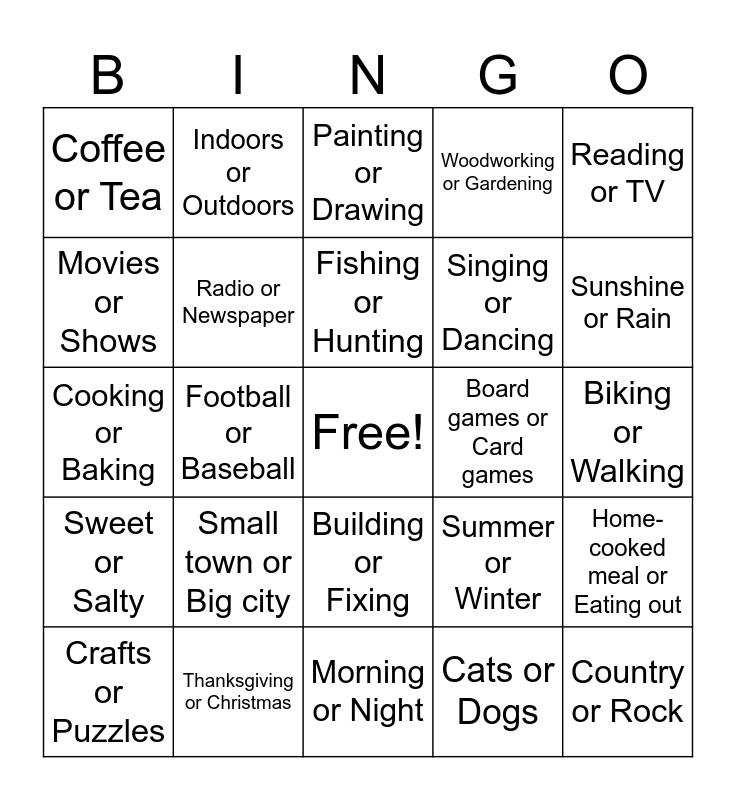 This bingo card has a free space and 24 words: Crafts or Puzzles, Small town or Big city, Fishing or Hunting, Cats or Dogs, Reading or TV, Coffee or Tea, Indoors or Outdoors, Painting or Drawing, Board games or Card games, Biking or Walking, Cooking or Baking, Radio or Newspaper, Summer or Winter, Home-cooked meal or Eating out, Movies or Shows, Thanksgiving or Christmas, Morning or Night, Woodworking or Gardening, Sunshine or Rain, Sweet or Salty, Football or Baseball, Building or Fixing, Singing or Dancing and Country or Rock.