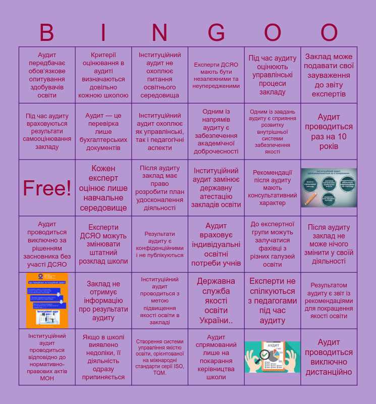 This bingo card has 3 images and 33 words: Державна служба якості освіти України.., Інституційний аудит проводиться з метою підвищення якості освіти в закладі, Аудит спрямований лише на покарання керівництва школи, Під час аудиту враховуються результати самооцінювання закладу, Аудит проводиться виключно за рішенням засновника без участі ДСЯО, Інституційний аудит замінює державну атестацію закладів освіти, Аудит — це перевірка лише бухгалтерських документів, Створення системи управління якістю освіти, орієнтованої на міжнародні стандарти серії ISO, TQM., Під час аудиту оцінюють управлінські процеси закладу, Експерти не спілкуються з педагогами під час аудиту, Аудит проводиться раз на 10 років, Експерти ДСЯО мають бути незалежними та неупередженими, Результатом аудиту є звіт із рекомендаціями для покращення якості освіти, Кожен експерт оцінює лише навчальне середовище, Одним із напрямів аудиту є забезпечення академічної доброчесності, Аудит передбачає обов’язкове опитування здобувачів освіти, Рекомендації після аудиту мають консультативний характер, Free!, Інституційний аудит не охоплює питання освітнього середовища, Після аудиту заклад має право розробити план удосконалення діяльності, Експерти ДСЯО можуть змінювати штатний розклад школи, Аудит враховує індивідуальні освітні потреби учнів, Результати аудиту є конфіденційними і не публікуються, До експертної групи можуть залучатися фахівці з різних галузей освіти, Критерії оцінювання в аудиті визначаються довільно кожною школою, Одним із завдань аудиту є сприяння розвитку внутрішньої системи забезпечення якості, Якщо в школі виявлено недоліки, її діяльність одразу припиняється, Інституційний аудит охоплює як управлінські, так і педагогічні аспекти, Заклад може подавати свої зауваження до звіту експертів, Аудит проводиться виключно дистанційно, Інституційний аудит проводиться відповідно до нормативно-правових актів МОН, Після аудиту заклад не може нічого змінити у своїй діяльності and Заклад не отримує інформацію про результати аудиту.
