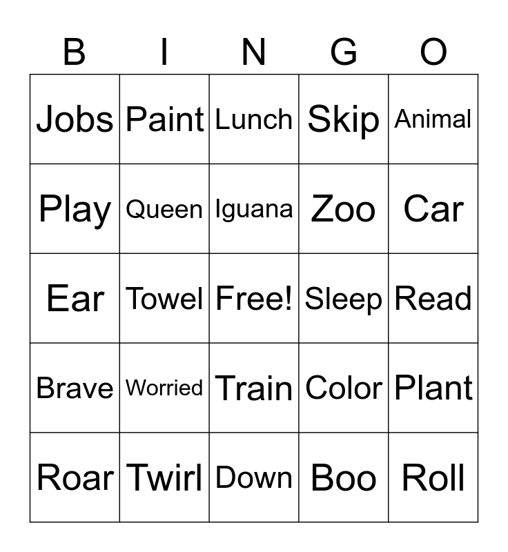 This bingo card has a free space and 74 words: Dark, School, Lunch, Bus, Rabbit, Write, Elephant, Finger, Roar, Belt, Hop, Shaker, Iguana, Play, Slide, Towel, Scared, Car, Race, Ear, Queen, Paint, Skip, Build, Roll, Dino, Look, Cut, Cook, Hang, Animal, Snow, Block, Bike, Crying, Boo, Hurt, Doctor, Jellyfish, Party, Down, Twirl, Feeling, Finish, Tug, Jobs, Sick, Worried, Kick, Fire, Bake, Swim, Read, Scoop, Splash, Silly, Train, Give, King, Plant, Zoo, Taste, Brave, Chick, Sleep, Soil, Face, Car, Color, Karate, Balloon, House, Carrot and Drive.