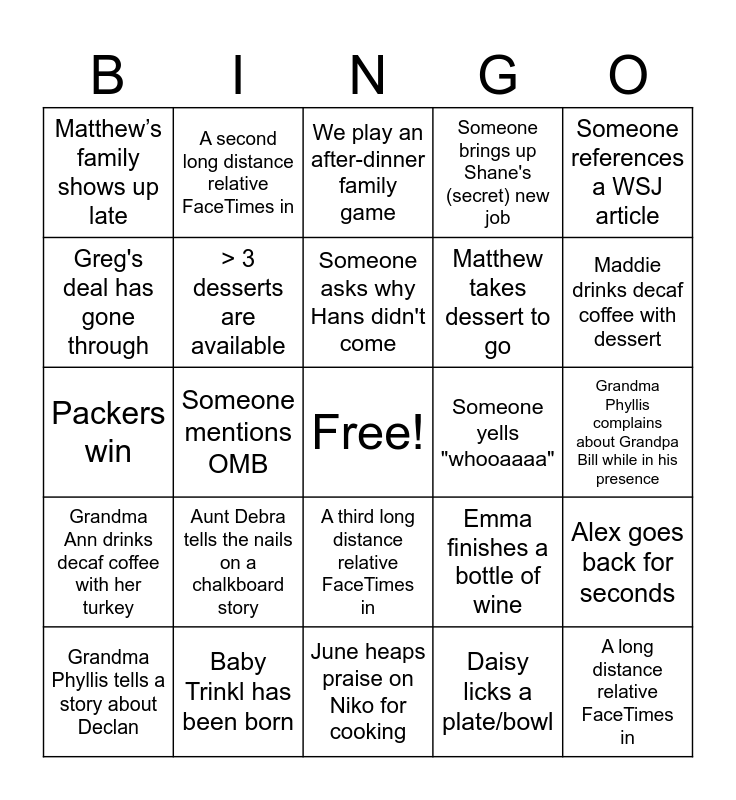 This bingo card has a free space and 24 words: Aunt Debra tells the nails on a chalkboard story, Baby Trinkl has been born, Someone asks why Hans didn't come, Grandma Phyllis tells a story about Declan, Someone references a WSJ article, Matthew’s family shows up late, Greg's deal has gone through, A second long distance relative FaceTimes in, Someone yells "whooaaaa", A third long distance relative FaceTimes in, Matthew takes dessert to go, Packers win, Emma finishes a bottle of wine, Alex goes back for seconds, > 3 desserts are available, Daisy licks a plate/bowl, Grandma Phyllis complains about Grandpa Bill while in his presence, We play an after-dinner family game, Maddie drinks decaf coffee with dessert, Someone mentions OMB, A long distance relative FaceTimes in, Grandma Ann drinks decaf coffee with her turkey, Someone brings up Shane's (secret) new job and June heaps praise on Niko for cooking.