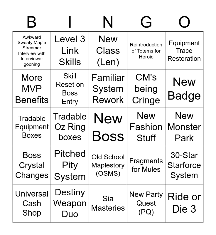 This bingo card has a free space and 24 words: Universal Cash Shop, Pitched Pity System, Familiar System Rework, New Party Quest (PQ), Equipment Trace Restoration, Awkward Sweaty Maple Streamer Interview with Interviewer gooning, Level 3 Link Skills, New Class (Len), New Fashion Stuff, New Monster Park, Tradable Equipment Boxes, Skill Reset on Boss Entry, Fragments for Mules, 30-Star Starforce System, More MVP Benefits, Destiny Weapon Duo, Sia Masteries, Reintroduction of Totems for Heroic, New Badge, Boss Crystal Changes, Tradable Oz Ring boxes, Old School Maplestory (OSMS), CM's being Cringe and Ride or Die 3.