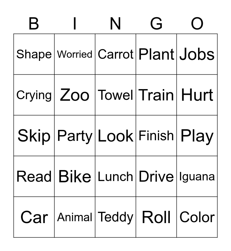 This bingo card has a free space and 87 words: Dark, School, Lunch, Bus, Rabbit, Write, Elephant, Finger, Roar, Belt, Hop, Shaker, Iguana, Play, Slide, Towel, Scared, Car, Race, Ear, Queen, Paint, Skip, Build, Roll, Dino, Look, Cut, Cook, Hang, Animal, Snow, Block, Bike, Crying, Boo, Hurt, Doctor, Jellyfish, Party, Down, Twirl, Feeling, Finish, Tug, Jobs, Sick, Worried, Kick, Fire, Bake, Swim, Read, Scoop, Splash, Silly, Train, Give, King, Plant, Zoo, Lick, Brave, Chick, Sleep, Soil, Face, Car, Color, Karate, Balloon, House, Carrot, Drive, Shut, Wash, Baby, Teddy, Walk, Trip, Shark, Cream, Ride, Snorkel, Bend, Shape and Digger.