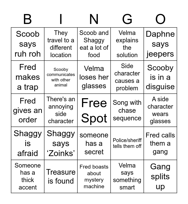 This bingo card has a free space and 24 words: Shaggy says ‘Zoinks’, Treasure is found, Velma loses her glasses, Someone has a thick accent, Daphne says jeepers, Scoob says ruh roh, Fred makes a trap, They travel to a different location, Song with chase sequence, someone has a secret, Side character causes a problem, Fred gives an order, Police/sheriff tells them off, Fred calls them a gang, Scooby communicates with other animal, Velma says something smart, A side character wears glasses, Scoob and Shaggy eat a lot of food, Scooby is in a disguise, There's an annoying side character, Gang splits up, Shaggy is afraid, Velma explains the solution and Fred boasts about mystery machine.