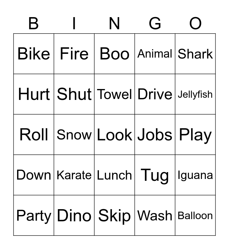 This bingo card has a free space and 89 words: Dark, School, Lunch, Bus, Rabbit, Write, Elephant, Finger, Roar, Belt, Hop, Shaker, Iguana, Play, Slide, Towel, Scared, Car, Race, Ear, Queen, Paint, Skip, Build, Roll, Dino, Look, Cut, Cook, Hang, Animal, Snow, Block, Bike, Crying, Boo, Hurt, Doctor, Jellyfish, Party, Down, Twirl, Feeling, Finish, Tug, Jobs, Sick, Worried, Kick, Fire, Bake, Swim, Read, Scoop, Splash, Silly, Train, Give, King, Plant, Zoo, Lick, Brave, Chick, Sleep, Soil, Face, Car, Color, Karate, Balloon, House, Carrot, Drive, Shut, Wash, Baby, Teddy, Walk, Trip, Shark, Cream, Ride, Snorkel, Bend, Shape, Digger, Bath and Show.