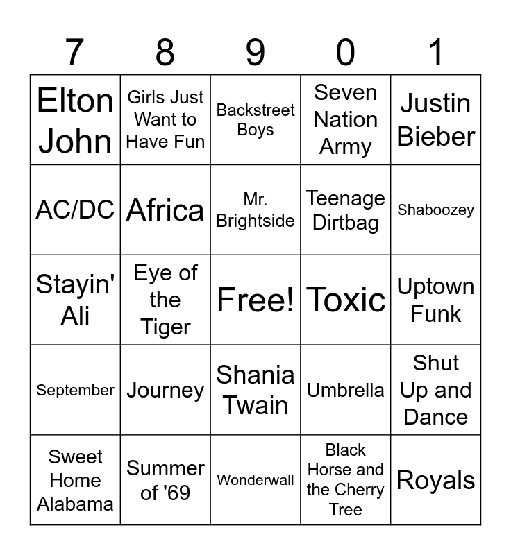 This bingo card has a free space and 49 words: Queen, Thriller, No Scrubs, Black Horse and the Cherry Tree, Uptown Funk, Fleetwood Mac, Girls Just Want to Have Fun, Barenaked Ladies, Teenage Dirtbag, Watermelon Sugar, AC/DC, Eye of the Tiger, Umbrella, Royals, Billy Joel, Under Pressure, Backstreet Boys, Toxic, Chappell Roan, Elton John, Summer of '69, Wonderwall, Seven Nation Army, Justin Bieber, Barracuda, Journey, Mr. Brightside, Avril Lavigne, Shut Up and Dance, September, Livin' on a Prayer, Shania Twain, Lady Gaga, Replay, Sweet Home Alabama, Whitney Houston, All Star, NSYNC, Shaboozey, Dancing Queen, Salt-N-Pepa, Spice Girls, Jonas Brothers, Maroon 5, Stayin' Ali, Africa, Eminem, One Direction and Billie Eilish.