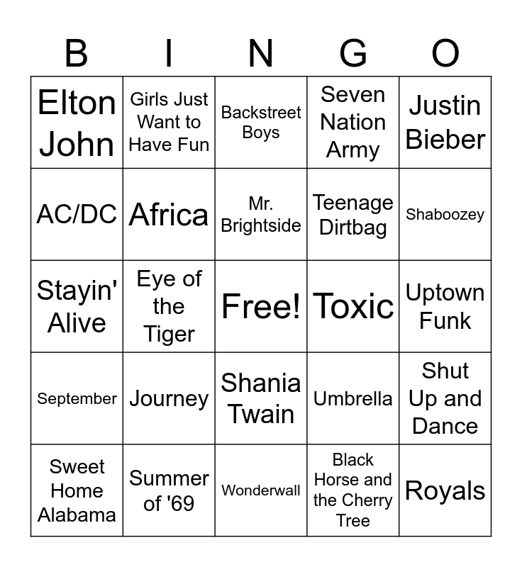 This bingo card has a free space and 49 words: Queen, Thriller, No Scrubs, Black Horse and the Cherry Tree, Uptown Funk, Fleetwood Mac, Girls Just Want to Have Fun, Barenaked Ladies, Teenage Dirtbag, Watermelon Sugar, AC/DC, Eye of the Tiger, Umbrella, Royals, Billy Joel, Under Pressure, Backstreet Boys, Toxic, Chappell Roan, Elton John, Summer of '69, Wonderwall, Seven Nation Army, Justin Bieber, Barracuda, Journey, Mr. Brightside, Avril Lavigne, Shut Up and Dance, September, Livin' on a Prayer, Shania Twain, Lady Gaga, Replay, Sweet Home Alabama, Whitney Houston, All Star, NSYNC, Shaboozey, Dancing Queen, Salt-N-Pepa, Spice Girls, Jonas Brothers, Maroon 5, Stayin' Alive, Africa, Eminem, One Direction and Billie Eilish.
