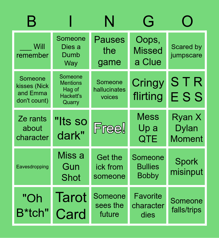 This bingo card has a free space and 24 words: Miss a Gun Shot, Tarot Card, Someone hallucinates voices, "Oh B*tch", Scared by jumpscare, ___ Will remember, Someone kisses (Nick and Emma don't count), Someone Dies a Dumb Way, Mess Up a QTE, Get the ick from someone, Cringy flirting, Ze rants about character, Someone Bullies Bobby, Spork misinput, Someone Mentions Hag of Hackett's Quarry, Favorite character dies, Ryan X Dylan Moment, Pauses the game, S T R E S S, "Its so dark", Someone falls/trips, Eavesdropping, Oops, Missed a Clue and Someone sees the future.