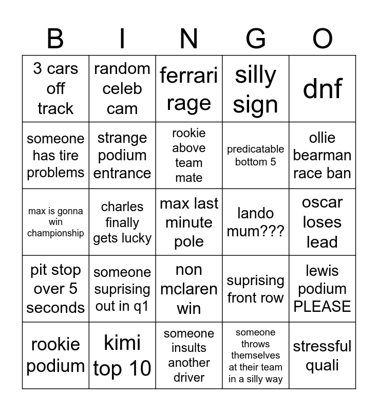 This bingo card has a free space and 24 words: someone suprising out in q1, kimi top 10, rookie above team mate, rookie podium, dnf, 3 cars off track, someone has tire problems, random celeb cam, lando mum???, non mclaren win, predicatable bottom 5, max is gonna win championship, suprising front row, lewis podium PLEASE, strange podium entrance, someone throws themselves at their team in a silly way, oscar loses lead, ferrari rage, ollie bearman race ban, charles finally gets lucky, stressful quali, pit stop over 5 seconds, silly sign and someone insults another driver.