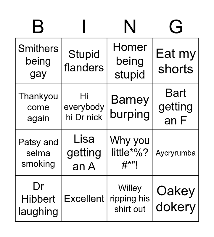 This bingo card has 16 words: Excellent, Aycryrumba, Homer being stupid, Smithers being gay, Patsy and selma smoking, Stupid flanders, Why you little*%?#*"!, Willey ripping his shirt out, Thankyou come again, Hi everybody hi Dr nick, Dr Hibbert laughing, Eat my shorts, Lisa getting an A, Bart getting an F, Barney burping and Oakey dokery.
