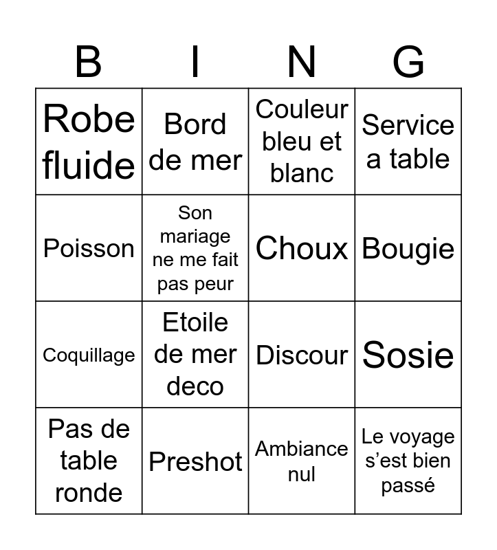 This bingo card has 16 words: Preshot, Sosie, Couleur bleu et blanc, Robe fluide, Coquillage, Bord de mer, Discour, Ambiance nul, Poisson, Son mariage ne me fait pas peur, Pas de table ronde, Service a table, Etoile de mer deco, Bougie, Choux and Le voyage s’est bien passé.