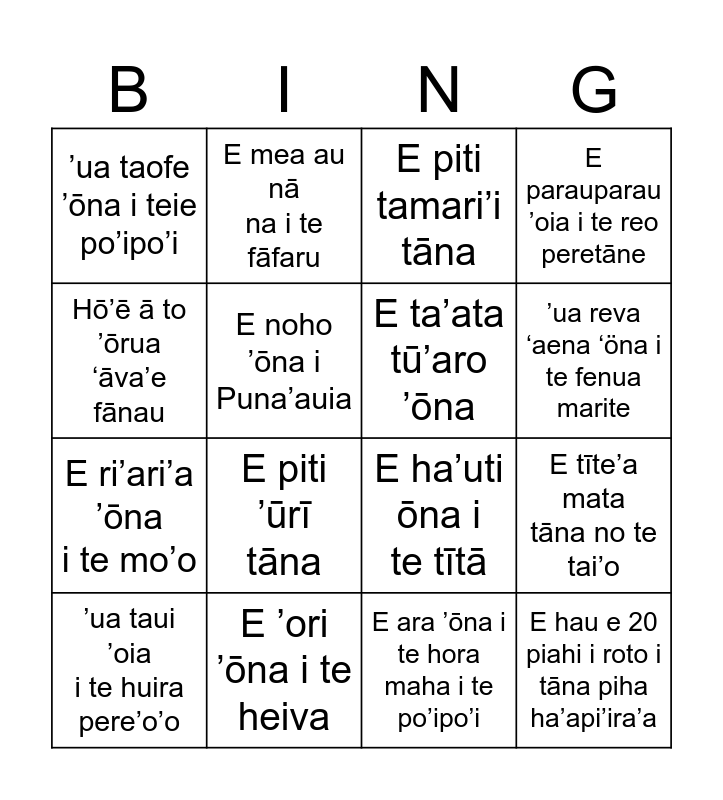 This bingo card has 16 words: E ’ori ’ōna i te heiva, E tīte’a mata tāna no te tai’o, E piti tamari’i tāna, ’ua taofe ’ōna i teie po’ipo’i, E ri’ari’a ’ōna i te mo’o, E mea au nā na i te fāfaru, E ha’uti ōna i te tītā, E ara ’ōna i te hora maha i te po’ipo’i, Hō’ē ā to ’ōrua ‘āva’e fānau, E noho ’ōna i Puna’auia, ’ua taui ’oia i te huira pere’o’o, E parauparau ’oia i te reo peretāne, E piti ’ūrī tāna, ’ua reva ‘aena ‘öna i te fenua marite, E ta’ata tū’aro ’ōna and E hau e 20 piahi i roto i tāna piha ha’api’ira’a.
