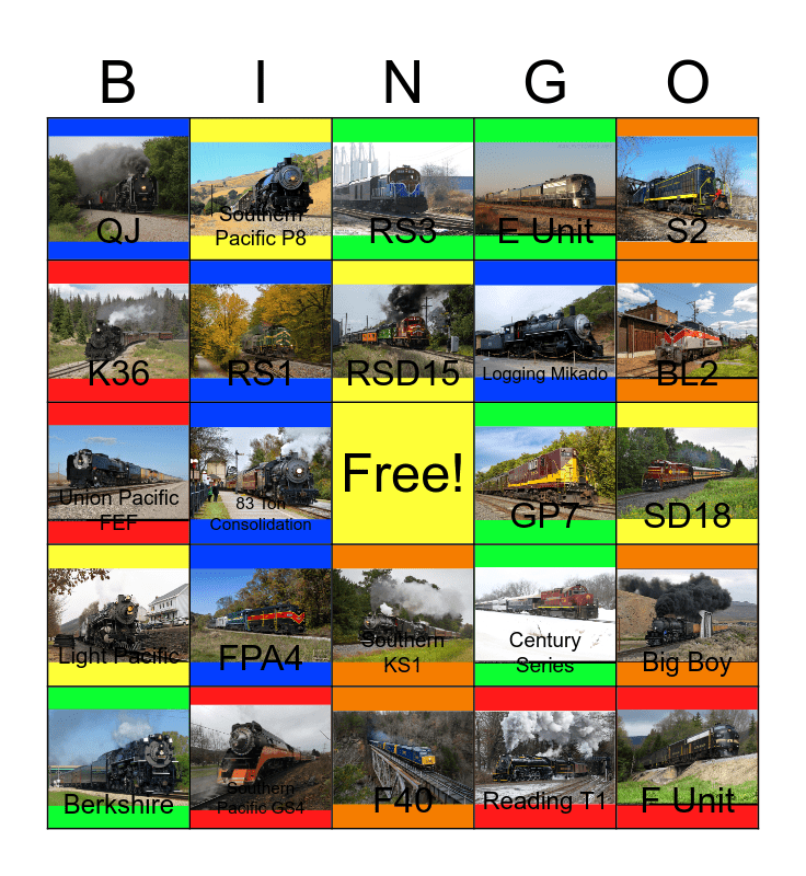 This bingo card has 24 images, a free space and 24 words: FPA4, Southern Pacific GS4, RSD15, Berkshire, S2, QJ, K36, Southern Pacific P8, GP7, Southern KS1, Logging Mikado, Union Pacific FEF, Century Series, Big Boy, RS1, Reading T1, SD18, RS3, BL2, 83 Ton Consolidation, F Unit, Light Pacific, E Unit and F40.
