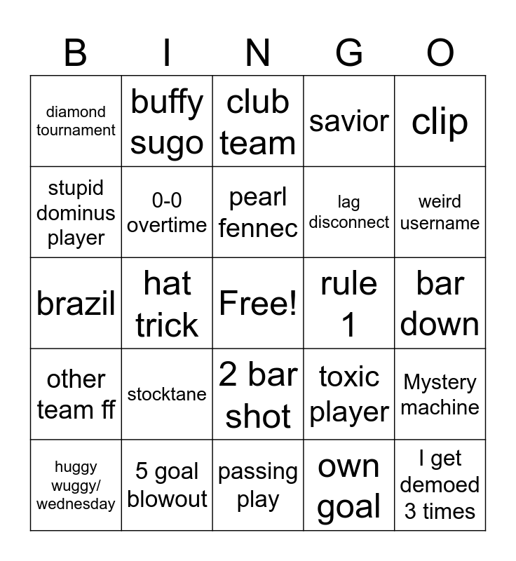 This bingo card has a free space and 24 words: stocktane, 5 goal blowout, pearl fennec, huggy wuggy/ wednesday, clip, diamond tournament, stupid dominus player, buffy sugo, rule 1, 2 bar shot, lag disconnect, brazil, toxic player, Mystery machine, 0-0 overtime, own goal, bar down, club team, weird username, hat trick, I get demoed 3 times, other team ff, savior and passing play.