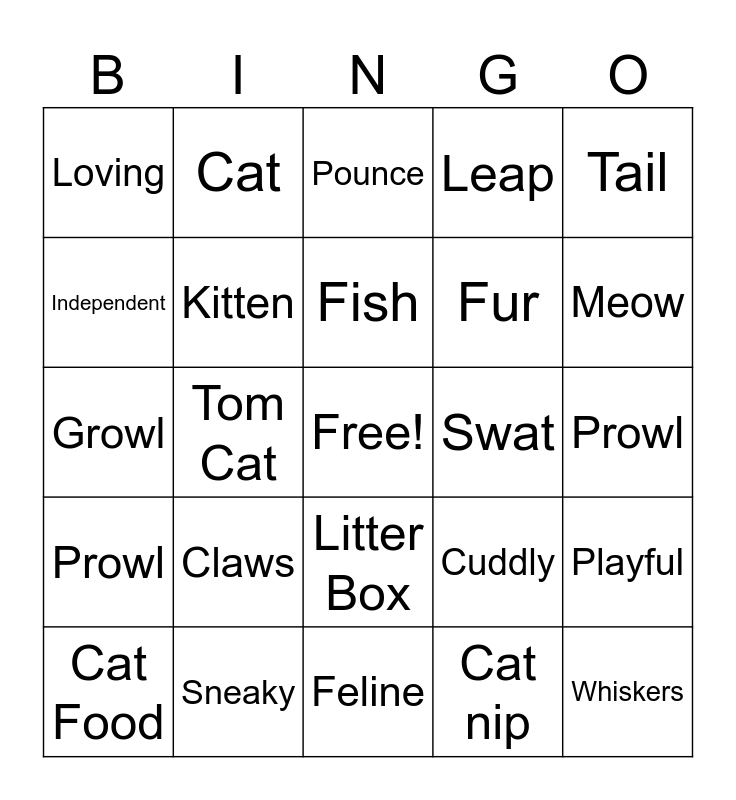 This bingo card has a free space and 30 words: Sneaky, Mouse, Tom Cat, Licking, Loving, Pounce, Kitten, Litter Box, Swat, Feline, Prowl, Whiskers, Cat nip, Scratch, Meow, Paws, Cuddly, Prowl, Claws, Tail, Growl, Scratching Post, Cat, Fur, Independent, Leap, Playful, Cat Food, Fish and Purr.
