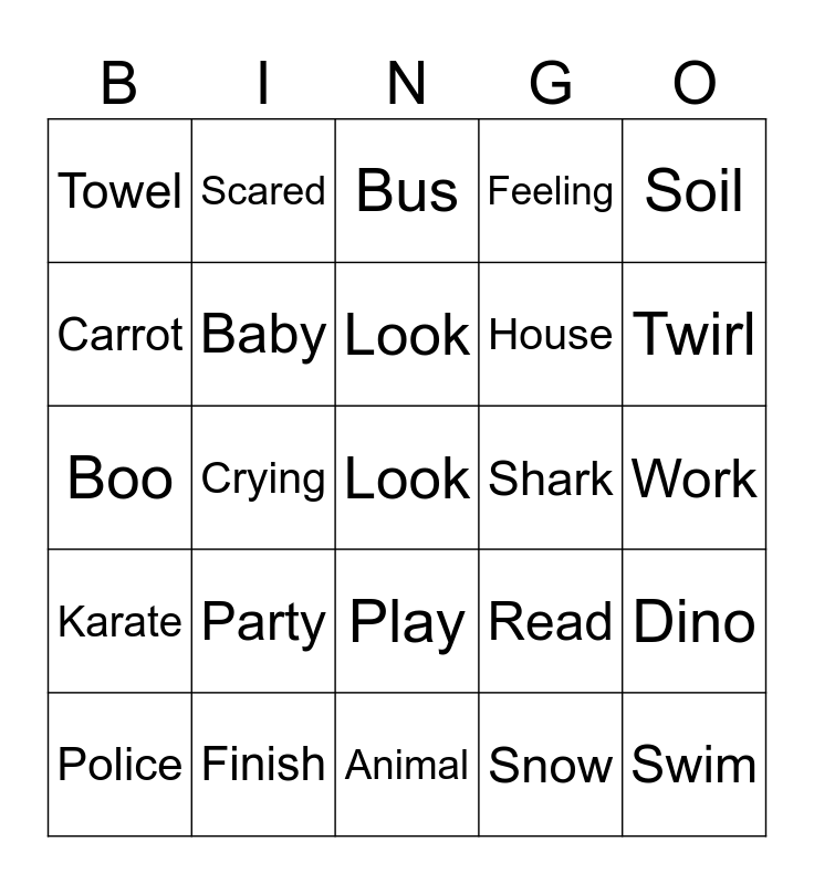 This bingo card has a free space and 99 words: Dark, School, Lunch, Bus, Rabbit, Write, Elephant, Finger, Roar, Belt, Hop, Shaker, Iguana, Play, Slide, Towel, Scared, Car, Race, Ear, Queen, Paint, Skip, Build, Roll, Dino, Look, Cut, Cook, Hang, Animal, Snow, Block, Bike, Crying, Boo, Hurt, Doctor, Jellyfish, Party, Down, Twirl, Feeling, Finish, Tug, Jobs, Sick, Worried, Kick, Fire, Bake, Swim, Read, Scoop, Splash, Silly, Train, Give, King, Plant, Zoo, Lick, Brave, Chick, Sleep, Soil, Face, Car, Color, Karate, Balloon, House, Carrot, Drive, Shut, Wash, Baby, Teddy, Walk, Trip, Shark, Cream, Ride, Snorkel, Bend, Shape, Digger, Bath, Work, Police, Empty, Cowboy, Scoot, Round, Hero, Ball, Duck, Trim and Curious.