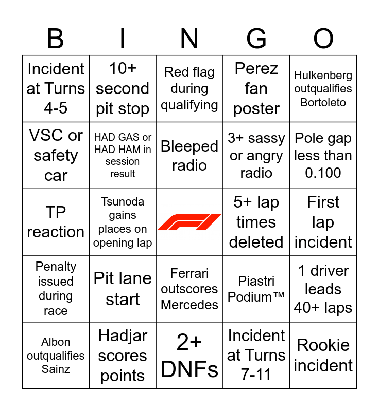 This bingo card has a free space and 27 words: Piastri Podium™️, Polesitter does not win the race, 3+ sassy or angry radio, 2+ DNFs, VSC or safety car, Red flag during qualifying, 10+ second pit stop, Penalty issued during race, 5+ lap times deleted, 1 driver leads 40+ laps, TP reaction, Perez fan poster, Albon outqualifies Sainz, Hadjar scores points, Pole gap less than 0.100, Both Alpines in bottom 5, HAD GAS or HAD HAM in session result, Bleeped radio, Pit lane start, Incident at Turns 4-5, First lap incident, Incident at Turns 7-11, Tsunoda gains places on opening lap, Rookie incident, Ferrari outscores Mercedes, Hulkenberg outqualifies Bortoleto and 2+ drivers from top 4 teams don’t make Q3.