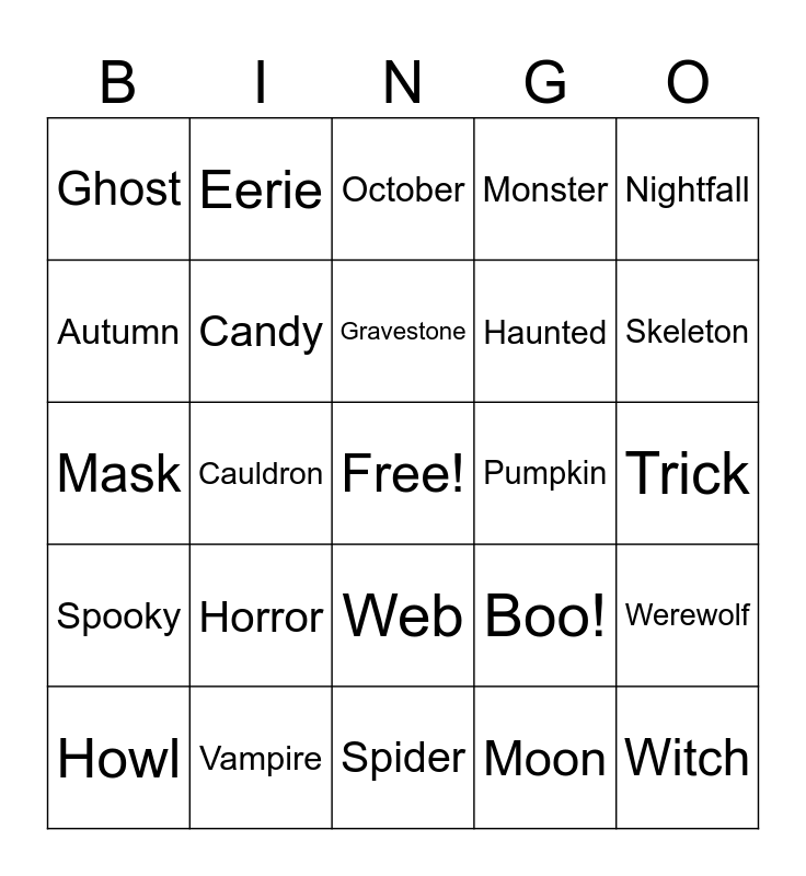 This bingo card has a free space and 29 words: Howl, Bats, Cauldron, Treat, Ghost, October, Candy, Horror, Pumpkin, Vampire, Trick, Witch, Spider, Moon, Skeleton, Costume, Web, Spooky, Nightfall, Mask, Boo!, Goblin, Haunted, Autumn, Monster, Eerie, Werewolf, Gravestone and Fog.