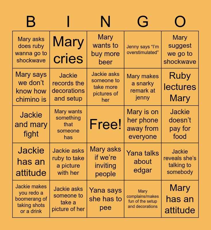 This bingo card has a free space and 24 words: Jackie asks ruby to take a picture with her, Jackie asks someone to take a picture of her, Jackie asks someone to take more pictures of her, Jackie makes you redo a boomerang of taking shots or a drink, Mary suggest we go to shockwave, Mary asks does ruby wanna go to shockwave, Mary says we don’t know how chimino is, Mary cries, Mary is on her phone away from everyone, Mary asks if we’re inviting people, Mary makes a snarky remark at jenny, Jackie and mary fight, Yana talks about edgar, Jackie reveals she’s talking to somebody, Jackie records the decorations and setup, Mary complains/makes fun of the setup and decorations, Jackie doesn’t pay for food, Mary wants to buy more beer, Ruby lectures Mary, Mary wants something that someone has, Mary has an attitude, Jackie has an attitude, Jenny says “I’m overstimulated” and Yana says she has to pee.