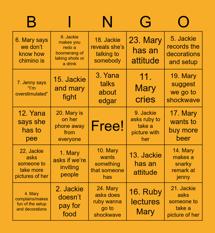 This bingo card has a free space and 24 words: 1. Mary asks if we’re inviting people, 2. Jackie doesn’t pay for food, 3. Yana talks about edgar, 4. Mary complains/makes fun of the setup and decorations, 5. Jackie records the decorations and setup, 6. Mary says we don’t know how chimino is, 7. Jenny says “I’m overstimulated”, 8. Jackie makes you redo a boomerang of taking shots or a drink, 9. Jackie asks ruby to take a picture with her, 10. Mary wants something that someone has, 11. Mary cries, 12. Yana says she has to pee, 13. Jackie has an attitude, 14. Mary makes a snarky remark at jenny, 15. Jackie and mary fight, 16. Ruby lectures Mary, 17. Mary wants to buy more beer, 18. Jackie reveals she’s talking to somebody, 19. Mary suggest we go to shockwave, 20. Mary is on her phone away from everyone, 21. Jackie asks someone to take a picture of her, 22. Jackie asks someone to take more pictures of her, 23. Mary has an attitude and 24. Mary asks does ruby wanna go to shockwave.