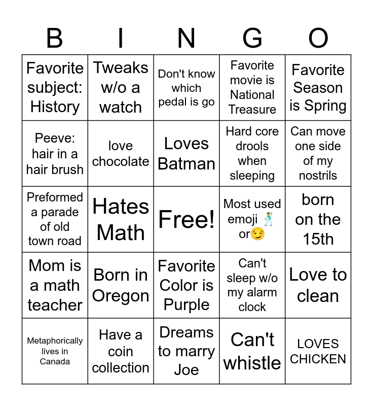 This bingo card has a free space and 39 words: Hates Cheese, 17 years old, 2 middle names, love chocolate, Metaphorically lives in Canada, Favorite Color is Purple, Loves Batman, Hates Beans, Favorite Season is Spring, Mom is a math teacher, Hates Math, Favorite movie is National Treasure, LOVES CHICKEN, born on the 15th, Most used emoji ๐บor๐, Born in Oregon, Favorite smell: fresh cut grass, Favorite subject: History, Never tried sushi, Can't sleep w/o my alarm clock, Peeve: hair in a hair brush, Dreams to marry Joe, Hard core drools when sleeping, Can move one side of my nostrils, Can sing all the lyrics to All Star, Got left at the library for 4hrs, Almost OD on medicine, Can't lie w/o smiling, Doesn't know the difference between democrat & republican, Tweaks w/o a watch, Peed on by a reindeer, Prefer showers over baths, Don't know which pedal is go, Have a coin collection, Can't whistle, Hate scary movies, Love to clean, Preformed a parade of old town road and Scared of escalators.