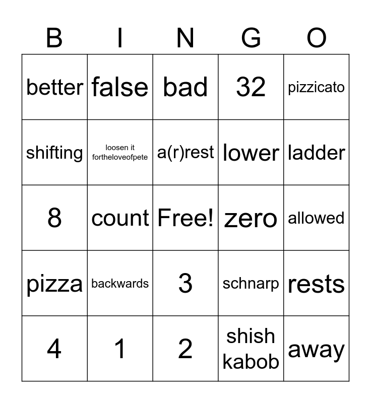 This bingo card has a free space and 29 words: 4, sound post, count, good, better, bad, loosen it fortheloveofpete, backwards, zero, 1, allowed, away, 2, shish kabob, ladder, outward, 3, pizza, pizzicato, 8, schnarp, higher, lower, shifting, 32, false, rests, a(r)rest and flat (b).