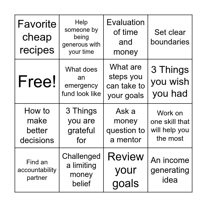 This bingo card has 16 words: Challenged a limiting money belief, Work on one skill that will help you the most, Evaluation of time and money, Favorite cheap recipes, How to make better decisions, Help someone by being generous with your time, Ask a money question to a mentor, Review your goals, Free!, What does an emergency fund look like, Find an accountability partner, Set clear boundaries, 3 Things you are grateful for, 3 Things you wish you had, What are steps you can take to your goals and An income generating idea.
