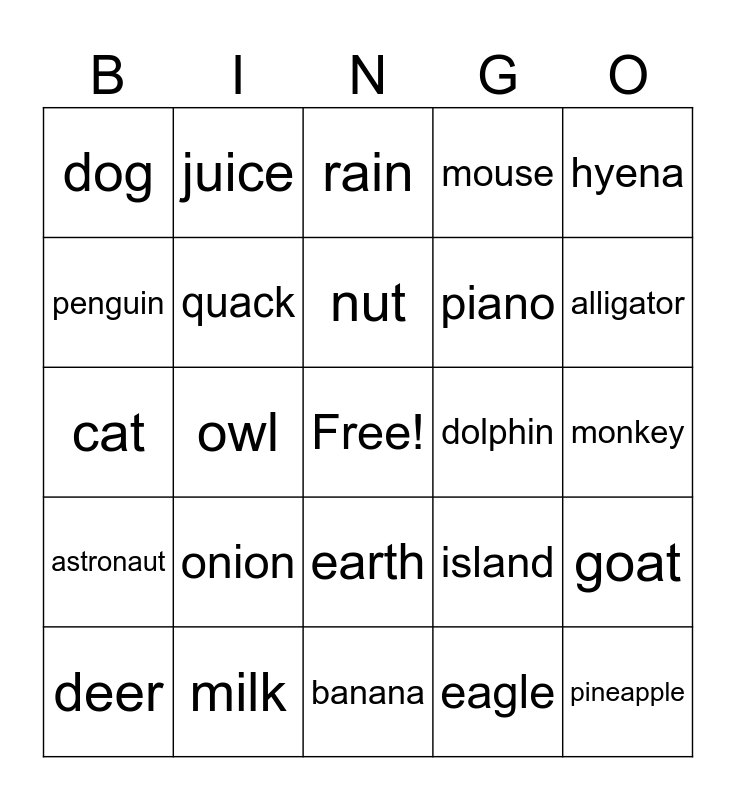 This bingo card has a free space and 83 words: rabbit, rocket, rain, rice, rollercoaster, rainbow, ring, quiet, quilt, queen, question, quail, quack, dolphin, duck, dog, deer, penguin, popsicle, pumpkin, pig, piano, pineapple, pool, owl, octopus, orange, ostrich, oven, olive, onion, otter, oyster, cat, carrot, bear, banana, bicycle, alligator, astronaut, llama, lemon, lion, ladybug, jeans, jellyfish, juice, igloo, iguana, ice cream, island, mouse, monkey, money, mushroom, moon, mango, mirror, milk, hippo, helicopter, heart, horse, hyena, happy, goat, guitar, flamingo, frog, fox, elephant, egg, ear, earth, eagle, eggplant, nurse, nut, nose, notebook, kangaroo, koala and king.