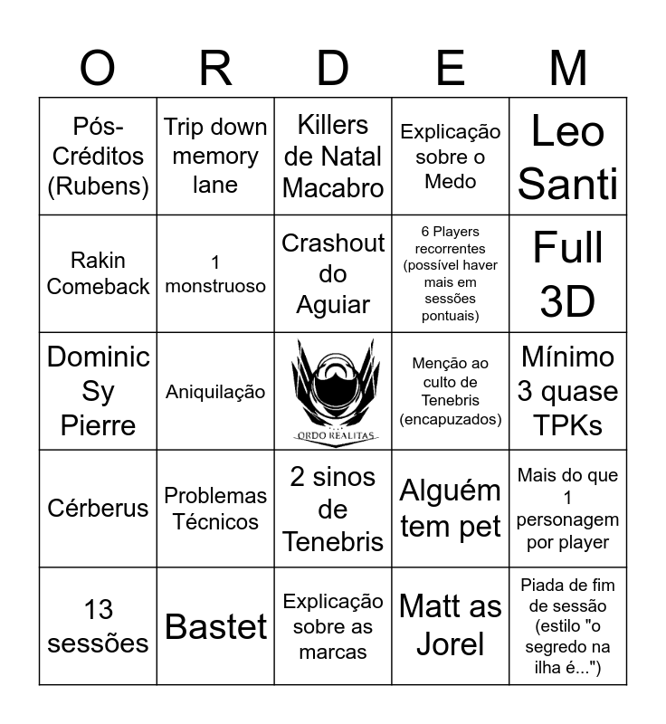 This bingo card has a free space and 24 words: Problemas Técnicos, Bastet, Crashout do Aguiar, 13 sessões, Leo Santi, Pós-Créditos (Rubens), Rakin Comeback, Trip down memory lane, Menção ao culto de Tenebris (encapuzados), 2 sinos de Tenebris, 6 Players recorrentes (possível haver mais em sessões pontuais), Dominic Sy Pierre, Alguém tem pet, Mais do que 1 personagem por player, 1 monstruoso, Matt as Jorel, Mínimo 3 quase TPKs, Killers de Natal Macabro, Full 3D, Aniquilação, Piada de fim de sessão (estilo "o segredo na ilha é..."), Cérberus, Explicação sobre o Medo and Explicação sobre as marcas.