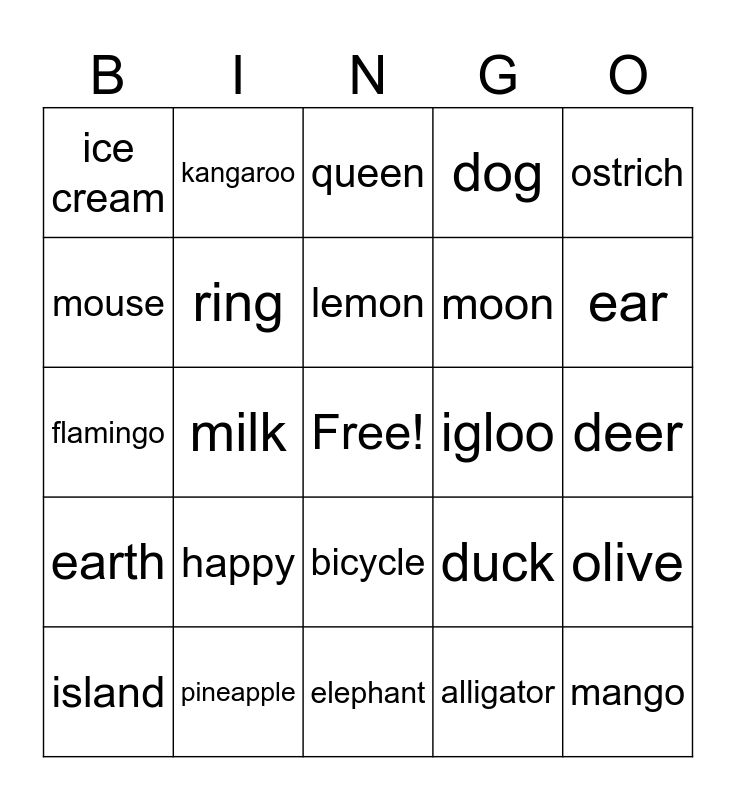 This bingo card has a free space and 83 words: quiet, quilt, queen, question, quail, quack, rabbit, rocket, rain, rice, rollercoaster, rainbow, ring, igloo, iguana, ice cream, island, mouse, monkey, money, mushroom, moon, mango, mirror, milk, hippo, helicopter, heart, horse, hyena, happy, goat, guitar, flamingo, frog, fox, elephant, egg, ear, earth, eagle, eggplant, nurse, nut, nose, notebook, kangaroo, koala, king, dolphin, duck, dog, deer, penguin, popsicle, pumpkin, pig, piano, pineapple, pool, owl, octopus, orange, ostrich, oven, olive, onion, otter, oyster, cat, carrot, bear, banana, bicycle, alligator, astronaut, llama, lemon, lion, ladybug, jeans, jellyfish and juice.