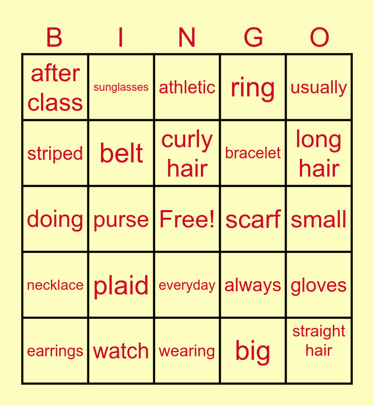 This bingo card has a free space and 24 words: plaid, watch, curly hair, earrings, usually, after class, striped, sunglasses, scarf, everyday, bracelet, doing, always, gloves, belt, big, small, athletic, long hair, purse, straight hair, necklace, ring and wearing.