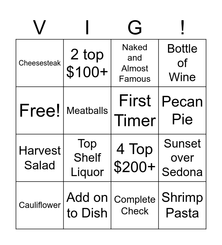 This bingo card has 16 words: Add on to Dish, Sunset over Sedona, Naked and Almost Famous, Cheesesteak, Harvest Salad, 2 top $100+, 4 Top $200+, Complete Check, Free!, Meatballs, Cauliflower, Bottle of Wine, Top Shelf Liquor, Pecan Pie, First Timer and Shrimp Pasta.