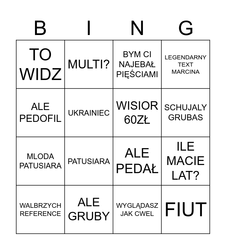 This bingo card has 16 words: ALE GRUBY, ILE MACIE LAT?, BYM CI NAJEBAŁ PIĘŚCIAMI, TO WIDZ, MLODA PATUSIARA, MULTI?, ALE PEDAŁ, WYGLĄDASZ JAK CWEL, ALE PEDOFIL, UKRAINIEC, WALBRZYCH REFERENCE, LEGENDARNY TEXT MARCINA, PATUSIARA, SCHUJALY GRUBAS, WISIOR 60ZŁ and FIUT.