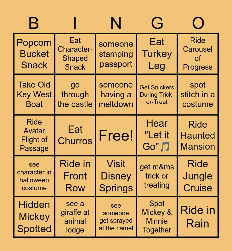 This bingo card has a free space and 72 words: Eat at Grand Floridian Dining, Eat Character-Shaped Snack, Eat Churros, Eat Dole Whip, Eat Ice Cream Sandwich, Eat Mickey Pretzel, Eat Turkey Leg, get a mickey waffle, Get Snickers During Trick-or-Treat, Hear Fireworks From Distance, Hidden Mickey Spotted, spot Elsa & Anna, spot stitch in a costume, Popcorn Bucket Snack, princess waves to you, Ride Avatar Flight of Passage, get m&ms trick or treating, Ride Carousel of Progress, Ride Frozen Ever After, Ride Haunted Mansion, Ride in Front Row, Ride in Rain, Ride Jungle Cruise, Ride Kilimanjaro Safari, Ride Na’vi River Journey, Ride Pirates of Caribbean, Ride Polynesian Monorail, Ride Resort Skyliner, Ride Small World, Ride Soarin’ Around World, see a giraffe at animal lodge, ride people mover, Spot Donald Waving, Spot Goofy Dancing, Spot Mickey & Minnie Together, Spot Someone in Hard Rock Cafe T-Shirt, Street Performer Shows, hit the pool, Take Old Key West Boat, see the hitchhiking ghosts, Visit Disney Springs, Visit Grand Floridian Lobby, Wait 60 Minutes in Line, Watch Festival Parade, Watch Fireworks Show, see character in halloween costume, see a squirrel with a disney snack, thumbs up on ride photo, see a rainbow, see matching family shirts, dropped ice cream, someone sleeping, ride gets stuck, Hear "Let it Go"🎵, see 3 ducks, try pulling the sword in the stone, someone stamping passport, someone having a meltdown, someone running to the bus, spot tigger in a costume, spot pooh in costume, see jack skellington, spot the sanderson sisters, see someone get sprayed at the camel, win a game of cornhole, take someones picture for them, go through the castle, go on a ride twice in a row, picture in front of the castle, family photo, picture in front of epcot ball and complete an epcot passport.