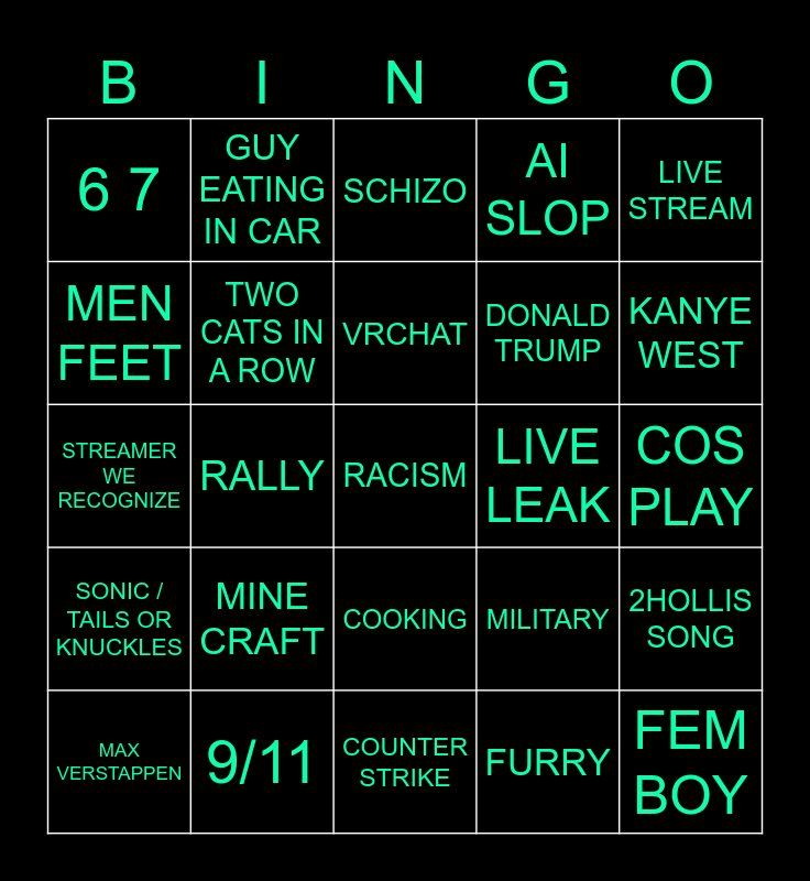 This bingo card has a free space and 24 words: MINE CRAFT, 9/11, VRCHAT, MAX VERSTAPPEN, LIVE STREAM, 6 7, MEN FEET, GUY EATING IN CAR, LIVE LEAK, COOKING, DONALD TRUMP, STREAMER WE RECOGNIZE, MILITARY, 2HOLLIS SONG, TWO CATS IN A ROW, FURRY, COS PLAY, SCHIZO, KANYE WEST, RALLY, FEM BOY, SONIC / TAILS OR KNUCKLES, AI SLOP and COUNTER STRIKE.